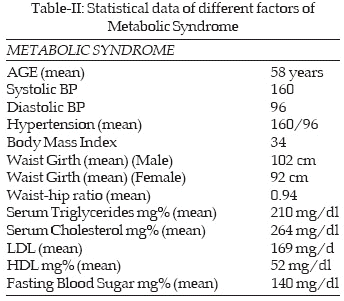 Waist-hip ratio (mean) was 0.94, Waist-girth (102 & 92cm. male and female respectively), and Body Mass Index was found to be 34. Mean Systolic and Diastolic Blood Pressure were found to be 160/96 respectively. Mean fasting blood sugar was 140 mg/dl. Serum Triglycerides (mean) was 210 mg/dl, LDL was found to be 169 mg/dl and HDL (mean) was 52 mg/dl. In this study the prevalence of cardiovascular disease was found to be 143/312 (46%), (84 males and 59 females). Among these patients, those of Angina Pectoris were 84/312 (27%) (48 males and 36 females), those of Acute Myocardial Infarction were 34/312(11%) (20 males and 14 females) and those of Congestive Cardiac Failure were 25/312 (8%) (16 males and 9 females). Increase in the abdominal girth and obesity with increased blood level of LDL and Hypertension proved to be life threatening since it resulted in cardiovascular disease.
