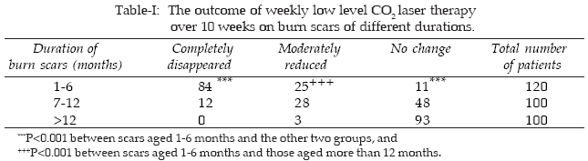 Patients and Methods: Patients who had suffered from burn scars were allocated into three groups according to the age of their scars: 0 to 6 (n=120), 7 to 12 (n=100) and over 12 months (n=100). A single weekly CO2 laser beam was applied at power scale of 4.5 of maximum possible of 30 which was increased by 0.5 degree to maximum power of 9 using a hand piece on LQ30 Slim Evolution CO2 laser scanner.