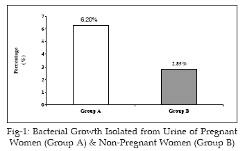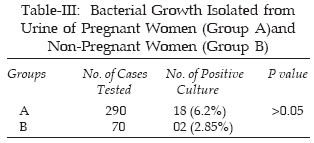 Out of 290 pregnant women there were 18 samples of urine (6.20%) and only 2 cases out of 70 (2.85%) were positive for significant bacteriuria in group B. The number of positive cases in pregnant women and non-pregnant women did not show any statistical difference (P>0.05). Results are shown in Table-III and in Figure-1.