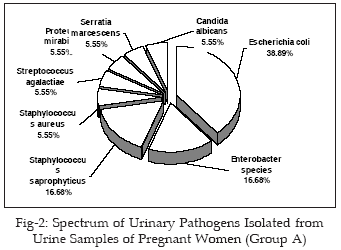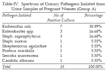 Subjects and Methods: Group A (study group) consisted of 290 pregnant women attending the OPD of Gynaecology and Obstetrics units for antenatal check up and Group B (control) consisted of 70 nonpregnant women of fertile age. Midstream urine was collected and aerobically incubated at 37oC on CLED agar. Growth of >1x105 CFU/mL was taken as significant bacteriuria. Gram-negative bacteria were identified by API 20-E and gram-positive by standard routine methods.