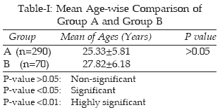 Table-II represents age-wise distribution of subjects in group A and group B. There were 199 subjects from group A in the age range of 18-25 years whereas 32 from group B, with means of ages 22±2.35 and 22.33±2.52 years respectively. In age range of 26-35 years and 36-45 years, the number of subjects with means of ages separately given. There is no statistical difference in the mean of ages of subjects in both groups (P>0.05).