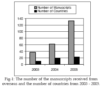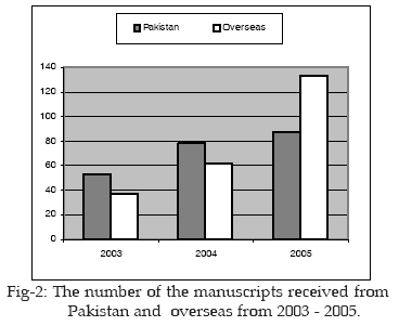 The number of manuscripts received from Pakistan and international sources durning 2003 to 2005 are shown in Fig-1 and Fig-2.