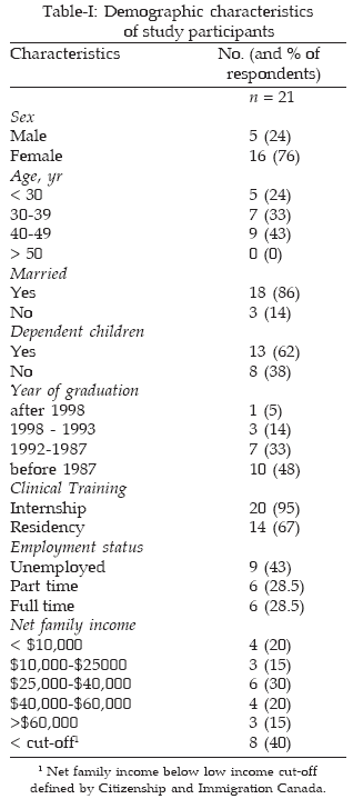 Twenty one IMGs responded to the call that they meet the eligibility criteria and participated in the survey: 12(57%) were from the South Asian sub-continent; 4(19%) from Eastern Europe; 3(14%) from the Americas (excluding Canada and the United States); and 1 (5%) each from Africa and the Far East. Further demographic characteristics of the participants are given in Table-I.