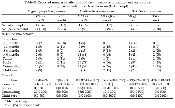 Data on exams required for licensure including the number of attempts, resources utilized and costs borne by IMGs were skewed. Details are given in Table-II. The median resource utilized by IMGs to be eligible to apply to OIMGP was 42% of their annual income (IQR = 21% - 74%).