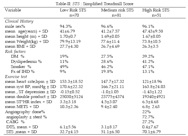 Results: A total of 212 subjects with 95% males underwent Treadmill Stress test of whom 51(24%) were designated as high risk group with a Simplified treadmill score of >60, who were advised Coronary angiography but only 22% of the high risk group underwent Coronary angiography and almost all were found to have two or three vessel disease.