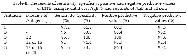 Table-II shows the sensitivity, specifity, positive and negative predictive values for AgB subunits as 12 kDa 12 or 16 kDa and 12 or 16 or 23 as well as Ag5.
