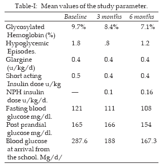 Thirteen patients with type 1 diabetes between the age of 11 and 16 years were studied. At the beginning of the study all patients were on glargine insulin plus premeals short acting insulin (as part). They continued on the same regimen except the short acting insulin before breakfast changed to NPH insulin. Glargine insulin was given as a separate injection and at a separate site. Patients were asked to perform home monitoring of blood glucose (HMBG), and keep a diary and were requested to report to the clinic every month. The HMBG should be done 6 times per day at least 3 days a week whereas on other days it should be performed twice per day and on arrival from the school every day. Performance checks were made on patient’s glucometers at each of these monthly visits. Parameters studied included height, weight, HMBG reading, Glycosylated hemoglobin (HbA1C) and number of hypoglycemic episodes at baseline, 3 months and 6 months period. HbA1C was performed by High Performance Liquid Chromatography (HPLC). All data were registered in the data sheets prepared for this study. The purpose of the study and expected side effect like hypoglycemia in the school were explained to the patients and their parents. The consent forms were signed from all patients’ parents.