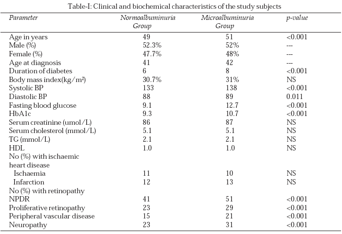 Statistics: Statistical analysis were done using SPSS version 10. Multiple logistic regression analysis was done using microalbuminuria as the dependent variable and age, body mass index, duration of diabetes, fasting blood glucose, glycosylated hemoglobin, serum cholesterol, serum triglyceride, and serum creatinine, systolic and diastolic blood pressure as independent variables.RESULTS