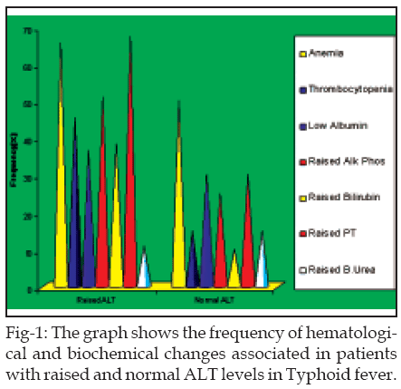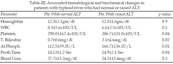 Conclusion: Typhoid fever causes significant hematological changes as well as hepatic dysfunction. The involvement of liver was associated with high frequency of extrahepatic complications. Despite the high incidence and serious nature of the hematological changes & liver involvement, these changes are transient and respond favorably to the appropriate antimicrobial therapy.