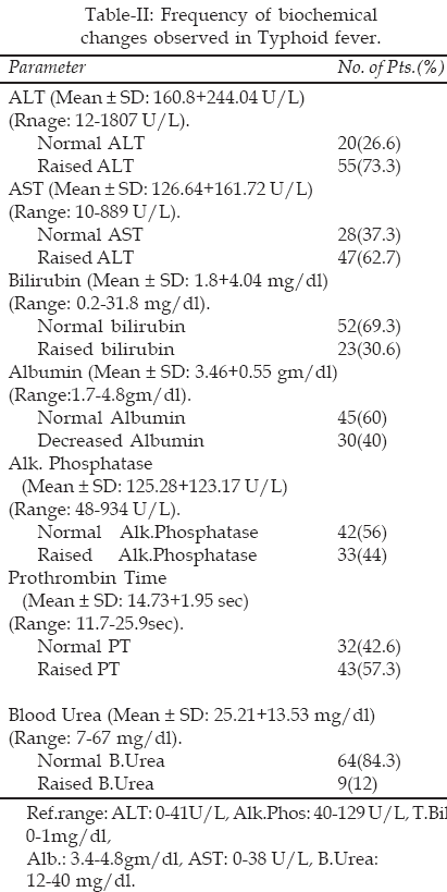 Objectives: The hematological and biochemical changes due to multi-organ involvement in typhoid fever are not uncommon. The aim of this study was to determine the frequency and severity of the above changes in adult patients admitted to the hospital because of typhoid fever.