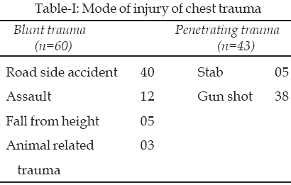 A total of 103 patients were studied for various chest injuries during eighteen months period. The age of the patients ranged from 12 to 70 years with a mean age of 36 years. Ninety five patients were males and only eight were females. Mode of injury is mentiond in Table-I.