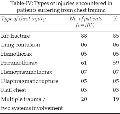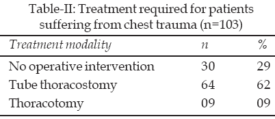 Methodology: This Case Series study with prospective data collection was conducted in Surgical Unit-II & Unit-VI of Civil Hospital Karachi, from September 2007 to February 2009. One hundred and three consecutive patients with thoracic trauma presenting in emergency department were evaluated. Patients above 12 years of age, who presented with chest trauma either alone or associated with multiple trauma were included.