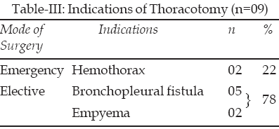 Thoracotomy was required in nine patients, in which only two were emergency thoracotomy and seven were elective. All thoracotomies were performed in penetrating injuries. Indication of emergency thoracotomy was initial drainage of blood >1500ml on chest intubation and internal mammary artery bleeding was found on surgery. Elective thoracotomies were performed by thoracic surgery department of Jinnah Postgraduate Medical Center, Karachi, where patients were referred after emergency management of chest trauma, in which five had bronchopleural fistula, two patients developed empyema as a complication of chest intubation and required decortication (Table-III).