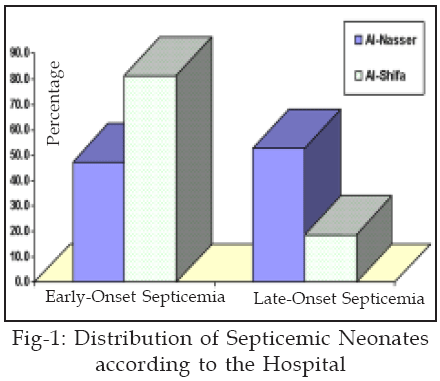 All hospitalized neonates in the (NICU) in Al-Shifa and Al- Nasser hospitals were included in this study. A total of 2487 were investigated in the two hospitals over the period from January 2004 to January 2005. Three hundred twenty eight neonates were found to be positive for the presence of bacteria in the blood culture with contamination rate of 13.2%. Isolated pathogens in Al -Nasser hospital with early and late onset of sepsis was 47.2% (102) and 52.8% (114) respectively whereas the early and late onset of sepsis in Al- Shifa hospital were 81.2% (91) and 18.8% (21) respectively as shown in Fig-1.
