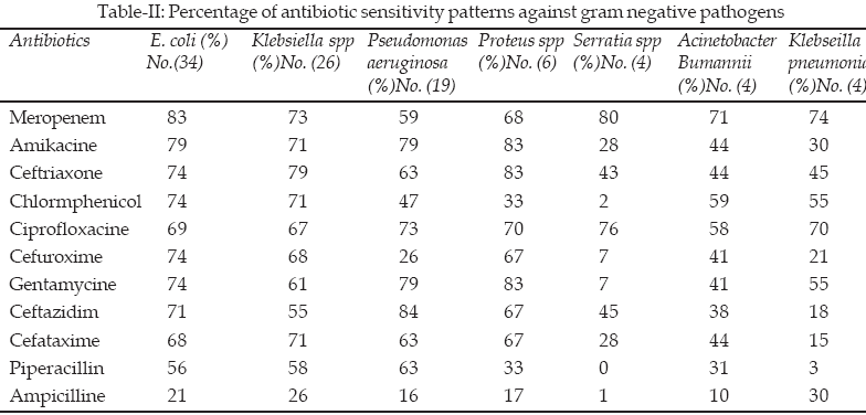 Table-II shows the antibiotic susceptibility pattern for Gram negative pathogens, with a considerable variation in the response of different isolates. The most susceptible antibiotic was Meropenem, follwed by Amikacin, Ceftriaxone, Chloramphenicol, Ciprofloxacin, Cefuroxime, Gentamycin, Ceftazidim, Cefataxime, Pipracellin and Ampicillin.