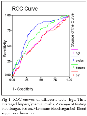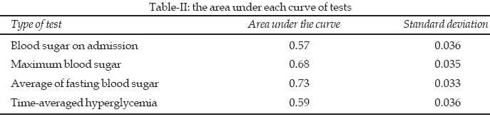 Table-II shows the area under each curve and its standard deviation. The mean fasting glucose had the highest area under curve (0.73). Pair wise comparisons between different tests are shown in Table-III. In multivariate analysis with sex and age and reason for ICU admission, all glucose indexes remained statistically significant in the binary logistic model.