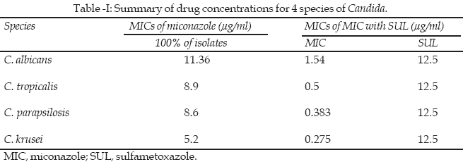 Table-I shows a list the MIC at which 100% of the strains were inhibited by miconazole and miconazole + sulfametoxazole. When inhibitory concentration of miconazole were tested with 12.5µg/ml sulfametoxazole, miconazole MICs decreased to 1.54, 0.5, 0.383 and 0.275µg/ml in C. albicans, C. tropicalis, C. parapsilosis and C. krusei respectively.