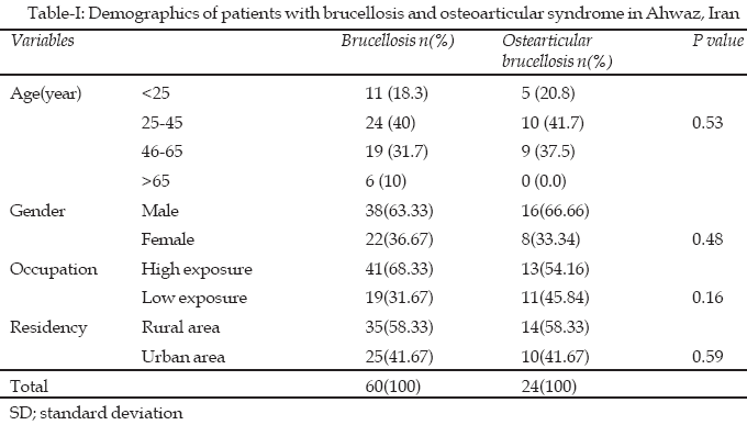 Out of total 60 patients with brucellosis 38(63.3%) were male and 22(36.7%) were female. Mean age of the patients were 36.2±12.3 (mean ± SD) years with the range of 18-65 years. Demographic data in brucellosis patients and osteoarticular involvement are shown in Table-I.
