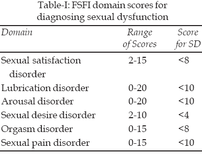 5 which is a specific, sensitive and standardized tool for diagnosing female SD. The index has six domains viz, disorder of sexual satisfaction, lubrication, orgasm, sexual desire and sexual pain. The diagnostic score criteria for the various forms of female SD using the FSFI are summarized in Table-I. Ethical approval for this study was obtained from the ethical committee of the University of Benin Teaching Hospital, Benin City.