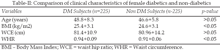 The clinical characteristics of the study and control groups are shown in Table-II. The female DM subjects tended to be older with greater anthropometric indices than the control group.