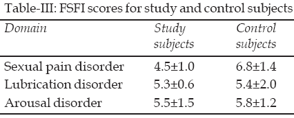 Four persons (1.7%) in the control group had sexual dysfunction. Sexual pain disorder was reported by the four persons, while three out of the four persons had lubrication disorder and sexual arousal disorder. The prevalence of female SD (6.6%) in the DM persons was significantly higher than in the control group. (6.6% v 1.7% p < 0.05). The distribution of the various forms of female SD and their domain score in both control and DM subject are shown in Table-III.