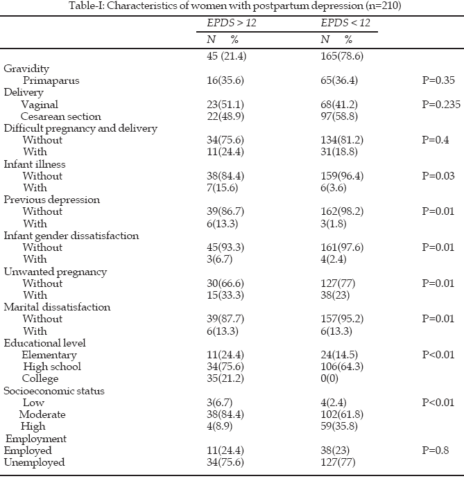 A total of two hundred ten women participated in the study. Mean age ± SD was 27.93±5.31 years. Frequency of positive screen test for depression was 45(21.5%).Unwanted pregnancy, marital dissatisfaction; infant gender dissatisfaction, lower socio-economical and educational level, infant illness and previous depression were statistically significant associated factors. For details see Table-I.