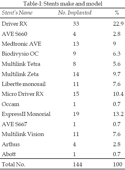 Patient selection: One hundred and twenty eight consecutive patients with elective placement of second-generation bare metal stents from August 2004 to September 2006 were enrolled in this study. Stent type is listed in Table-I, all of them were balloon expandable. The procedures were unsuccessful in two cases. In 126 patients 144 BMS were inserted in 134 vessels. Demographic parameters including age, gender, risk factors for coronary artery disease (hypertension, hyperlipidemia, diabetes mellitus, cigarette smoking and positive family history of ischemic heart disease) and patient history for angioplasty (MI or UA), angioplasty site, number of vessels, stents per patient, stent size and dose of plavix before angioplasty were collected from the hospital records.