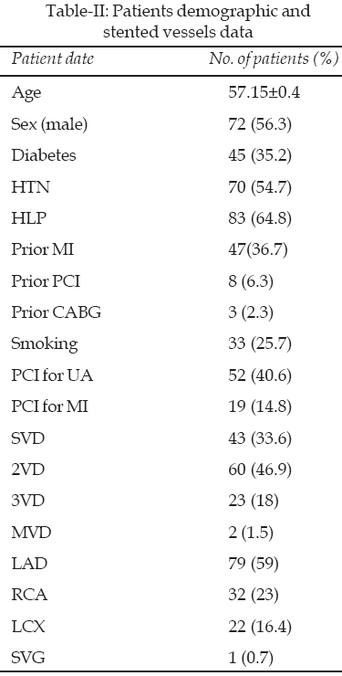 From 128 patients, 126 (98.43%) had a successful elective stent deployment. One hundred forty four BMS were implanted in 134 vessels. Demographic data and stented vessels are listed in Table-II.
