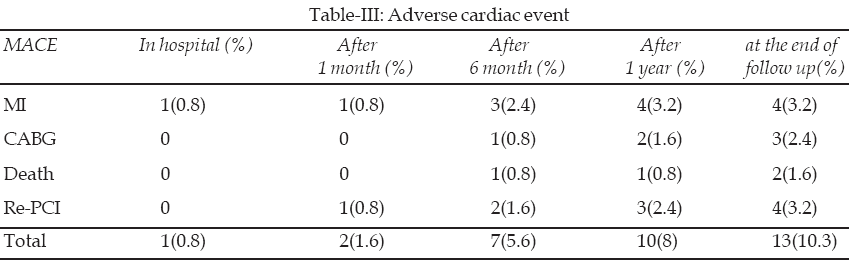 During hospital stay, there was no death or repeat revascularization. Three patients (2.4%) had coronary artery dissection; out of them one (0.8%) had Q-wave myocardial infarction. Three stents were overlapped to manage dissection. Stent did not pass the lesion in one case in spite of pre-dilatation. Only two patients (1.5%) needed to stay more than three days in the hospital.Seven days after discharge one patient (0.8%) had MI one (0.8%) had sepsis and one patient (0.8%) had sub-acute instent thrombosis, a second attempt for deploying another stent was unsuccessful. He underwent an uneventful CABG. After a mean follow-up of (246.4 month), 13(10.3%) patients had MACE [4MI (3.2%), 3 CABG (2.4%), four Repeat-PCI (3.2%) and two cardiac death(1.6%)] (Table-III). One and two year event free survival was 92.06% and 87.53% respectively. Two out of four patients with MI had CABG (1.6%) three month later. MI free survival for one and two years was 96.85%. One and two year death- free survival rate was 99.2% & 97.4% respectively. Four patients had repeat PCI and one of them died four month later. We found unstable angina (P value 0.02) as an independent predictor of MACE in our patients.