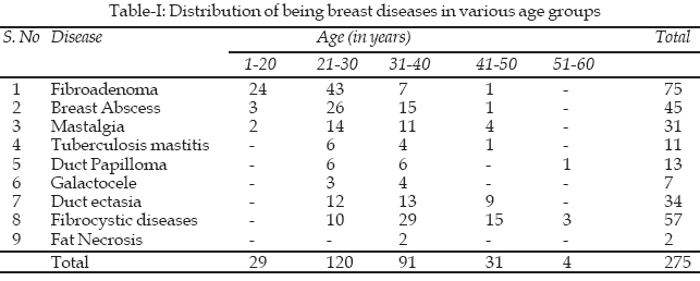 Results: A total of 275 patients were included in the study. About 44% (120/275) patients belonged to 3rd decade of life (age between: 21-30 years) followed by 33% from 4th decade (age between: 31 – 40 years). Fibroadenoma was the most common benign breast disease, seen in 27% (75/275) of patients, followed by fibrocystic disease seen in about 21% (57/275) patients.
