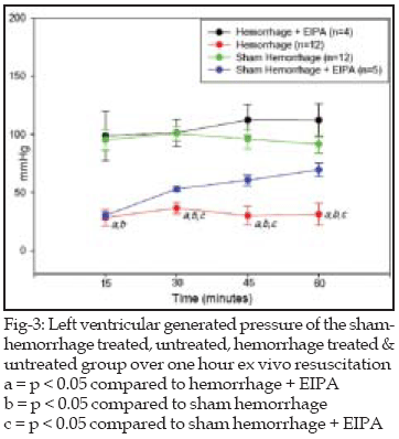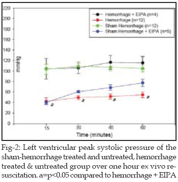Treatment with EIPA before resuscitation significantly improved the post-resuscitation myocardial function as compared to the saline resuscitated group. Exposure to 60 minutes hemorrhage and ex vivo resuscitation led to decrease in the LV generated pressure (Fig-3) (n=6).