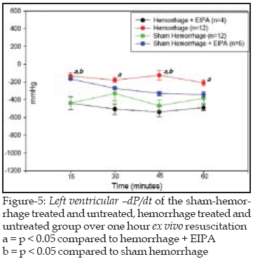 Left ventricular maximum + dP/dt (Fig-4) was significantly lower in the hemorrhage group as compared to the sham hemorrhage group and the hemorrhage treated group. Maximum - dP/dt was significantly higher in the hemorrhage group (Fig-5), compared to the hemorrhage treated group (P<0.05).