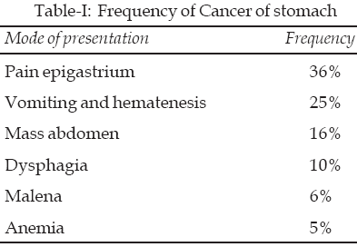 A total of 12 patients aged less than 30 had upper GI malignancies. Out of which three patients had esophageal carcinoma, four had gastric carcinoma and five were diagnosed to have lymphoma. Mode of presentation is shown in Table-I. Nine patients had prior gastric surgery. There were very few gastric ulcers. Most of the cases of carcinoma of stomach had fungating, cauliflower or polypoidal growth like macroscopic appearance.
