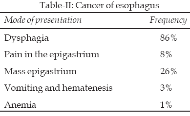 14 In another study from Balochistan region of Pakistan, carcinoma of esophagus was the third most common tumor and comprised 11.3% of the total registered cases.15 Esophageal malignancies are commonly reported in the sixth, seventh and eighth decades of life and are relatively rare at a younger age because they require a long period of carcinogenesis. This may account for its rarity in child hood. One patient in the present study who was 18 years old presented with dyspahagia and the subsequent histologic evaluation showed adenocarcinoma of esophagus.The prevalence of carcinoma of esophagus is unprecedentedly high in the countries bordering esophageal cancer belt. But it varies substantially depending upon the geographic location. High incidence areas have been identified in the Caspian Littoral region of northern Iran, southern republics of the former Soviet Union and northern China. The incidence surpasses 100 per 100,000 individuals. Over 20% of all cause mortality has been attributed to esophageal cancer. Northern part of Pakistan closely borders these regions. The incidence of esophageal cancer ranges from 10 to 50 in Sri Lanka, India, South Africa, France and Switzerland.