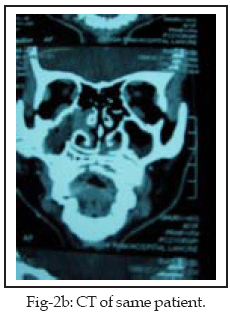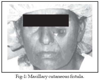 Maxillary sinus, frontal sinus, ethmoids and sphenoid sinus were involved, in descending order of frequency; maxilla was the most commonly affected. Five patients were diagnosed as having acute osteomyelitis (35%); an equal number were diagnosed as having chronic osteomyelitis of which one had a fistula on the cheek (Fig-1) and one had fistula due to tuberculosis (Fig-2ab).