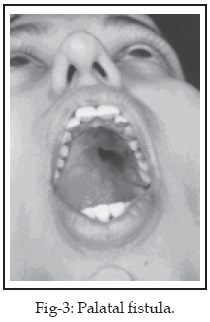 Odontogenic infections and chronic sinusitis each gave rise to osteomyelitis in two cases (10%) of the patients with osteomyelitis of the palate and maxilla combined of which one case had a fistula in the hard palate (Fig-3). Chronic sinusitis was the main cause of frontal bone osteomyelitis in two cases (10%), one of which had a discharging fistula in left frontal bone displacing the eye ball.