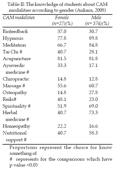 Knowledge of meditation, Tai Chi, ayuverdic medicine, massage, reiki, spirituality (pray) and herbal therapy were found statistically different between male and female students. Female students know more about Tai Chi, ayuverdic medicine, reiki, whilst the males had more knowledge about meditation, massage, spirituality (pray) and herbal therapy (p<0.05). Acupuncture was the most known modality among female students while hypnosis was the first among males (Table-II).