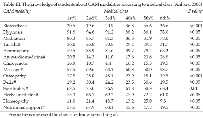 We evaluated the attitude towards CAM by using 5 questions and we found some statistically significant differences between different medical classes. In general the first three year medical class students had more positive attitudes towards CAM. While fifth year medical class students had the most negative attitude (Table-IV).