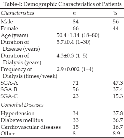 Methodology: The cross-sectional study was conducted on 150 Haemodialysis (HD) patients. HD patients were assessed by SGA, 3-day food intake, anthropometry, and some biochemical parameters.