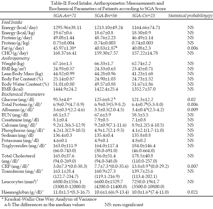 According to the Subjective Global Assessment (SGA) 47.3% of patients were well nourished (SGA-A), 37.4% were moderately malnourished (SGA-B) and 15.3% were severely malnourished (SGA-C) (Table-I). The mean SGA score was 4.6±0.3 (1–22). Although daily fat consumption of the SGA-A group was higher than SGA-B and SGA-C groups (p=0.006), there was no difference for the other nutrients.