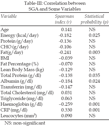 There was a negative correlation between SGA and serum total protein (r=–0.138, p=0.035), albumin (r=–0.184, p=0.024) and haemoglobin (r=–0.259, p=0.001) and a positive correlation between CRP (r=+0.330, p=0.001). A significant positive correlation between body fat percent and daily fat intake in SGA-C was determined. While there was a negative correlation between energy, fat intake and SGA score (r=-0.182, p=0.025 and r= –0.241, p=0.003, respectively), a correlation between carbohydrate, protein intake and SGA score was not found (Table-III).