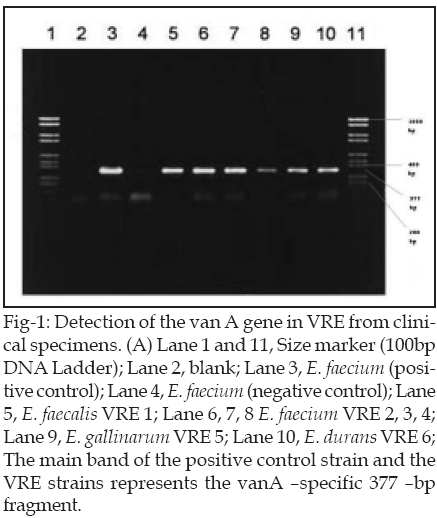 vanA gene: The vanA-specific 377-bp gene fragments of E. faecalis, E. faecium, E. durans, and E. gallinarum, were amplified from isolates and the results obtained for some strains are shown in figure. The positive control strain E. faecium contained the typical 377-bp fragment, and the negative control strain E. faecium did not.