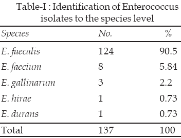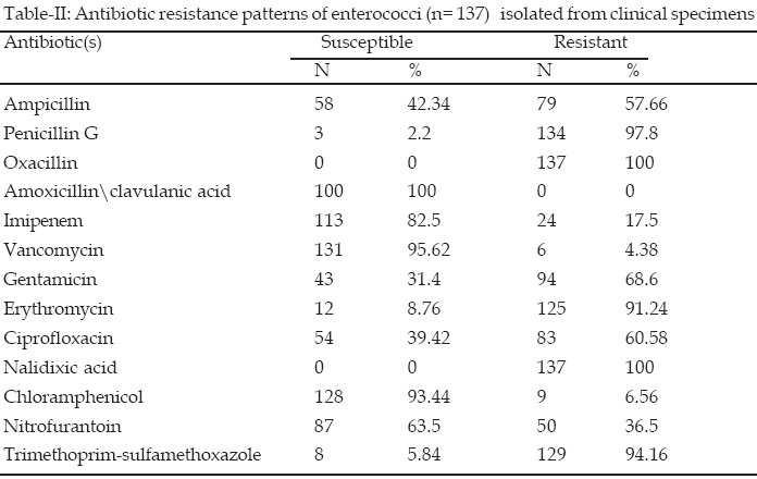 Collection of strains: A total of 137 strains were collected: 120 (87.59%) isolated from urine; five (3.65%) were from ascetic fluid; four (2.92%) were from blood; three (2.19%) were from wounds; three (2.19%) were from Catheter; and two (1.46%) were from bone marrow. Distribution of Enterococcus isolates is shown in Table-I. A total of six VRE strains isolated during the investigation period, were identified to the species level as follows: One E. faecalis, three E. faecium, one E. gallinarum and one E. durans.