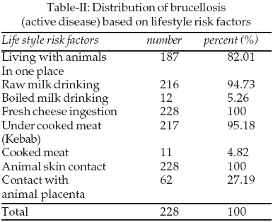 Results: Two hundred & twenty eight out of 3594 were positive for brucellosis (6.3%). Causative factors included consumption of raw milk (94.7%), fresh cheese (100%), uncooked meat (95.1%), animal skin contact (100%), contact with placenta (27.2%) and living with animal (82%).