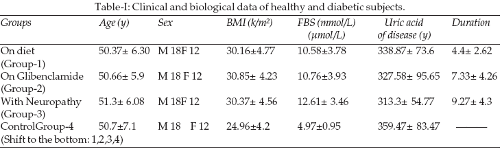 Clinical and biological data of healthy and diabetic subjects are summarized in Table-I. Diabetic patients and control have matched ages as shown by the non-significant differences between groups when compared with control group (P > 0.05). The number of male and female was identical. BMI was statistically high when compared with control group (P< 0.005). FBS was high in the diabetic group as compared with the control group (P < 0.001). Serum uric acid concentration was lower than control but they do not reach a significant level (P > 0.2) except in Group-3 (P < 0.05).