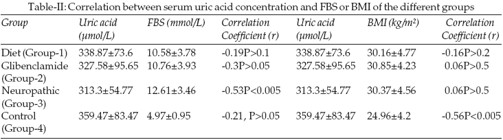 Table-II shows the relationship between uric acid and FBS and BMI of the different groups. Negative correlations were obtained except for BMI in the glibenclamide and naturopathic groups where no relationship was obtained (r= 0.06).