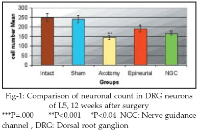 Methodology: This is a morphometeric study of dorsal root ganglion neurons of adult rats by Hoechst staining conducted at Neuroscience laboratory and Cellular and Molecular Center, Medical faculty, Iran University of Medical Sciences. Models of direct epineurial suture and using of nerve guidance channel of polyvinilydin flourid (PVDF) were used and neuronal number and volume of dorsal root ganglion of L5 were evaluated by morphometeric method.
