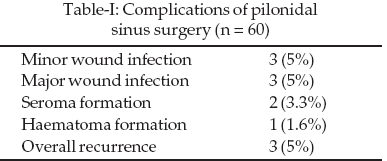 In all, six patients (10%) had wound infection. Out of these three were minor wound infections and remaining three were major wound infections. Wounds were laid open after removing the sutures and subsequently dressings were done in these patients for about ten to fifteen days. Two patients had seroma formation which were aspirated and both patients responded well. One patient had haematoma which was evacuated in out- patient department by removing few skin sutures. Wound was subsequently dressed for about two weeks. The mean follow up of patients was about twelve months (range 10-14). Only three patients had recurrence which represents an over all recurrence rate of 5%. These recurrences were identified during the follow up between 3-6 months. These three patients had blood / pussy discharge from the operated site. In two patients, secondary infection caused by residual hair and debris was responsible for recurrence and this was further complicated by inadequate wound care and insufficient attention to depilation. In third patient, the recurrence was caused by failure to identify small secondary sinus at the time of primary operation. The complications have been summarized in Table-I.