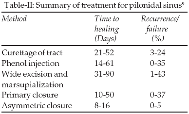 The treatment of pilonidal sinus is controversial. The number and variety of published techniques are testament to the complexity of treating pilonidal sinus and the fact that no single procedure is superior in all respect.1 An ideal operation should be simple, offer shorter hospitalization as well as rapid wound healing, a low recurrence rate, minimal pain, decreased time off work and cost effective.3 Allan Mersh in 1990 reviewed many surgical procedures available for symptomatic pilonidal sinus disease.9 The summary of his results is shown in Table-II.