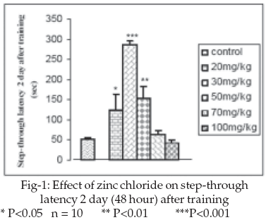 Methodology: Six pair adult wistar rats were taken for this experiment. One group of pregnant rats received a daily oral dose of 20mg/kg Zn as zinc chloride and the remaining groups received a daily oral dose of (30, 50, 70,100mg/kg) zinc chloride for two weeks by gavage. One month after birth, a shuttle box was used to test short-term and long-term memory. Two criteria were considered to behavioral test, including latency in entering dark chamber and time spent in the dark chamber.